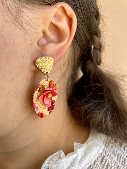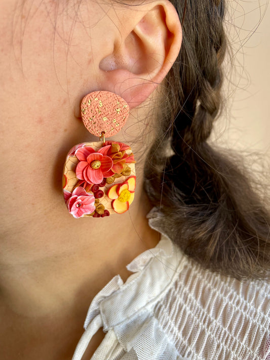 Mini-jardin d’oreilles – Boucles florales sculptées tons rose, doré, corail