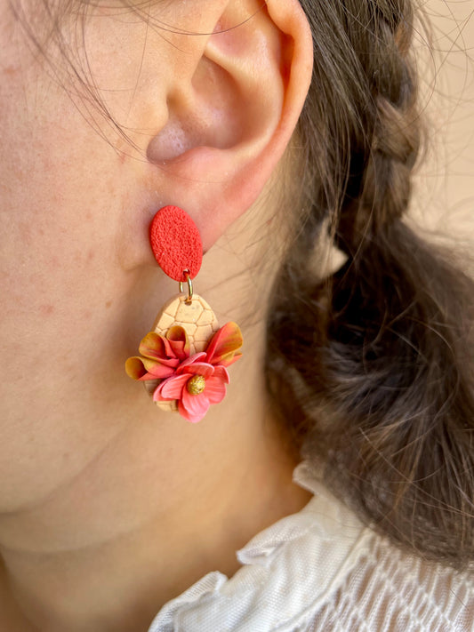 Mini-jardin d’oreilles – Boucles florales sculptées tons rose, corail