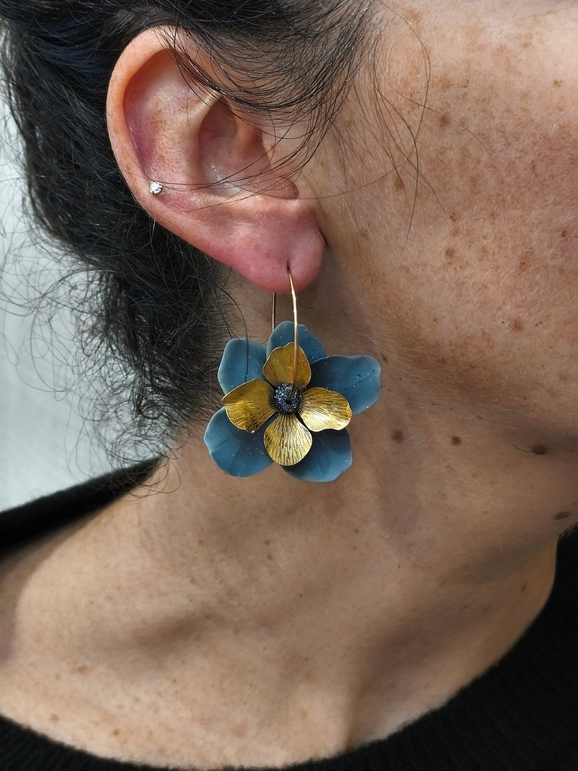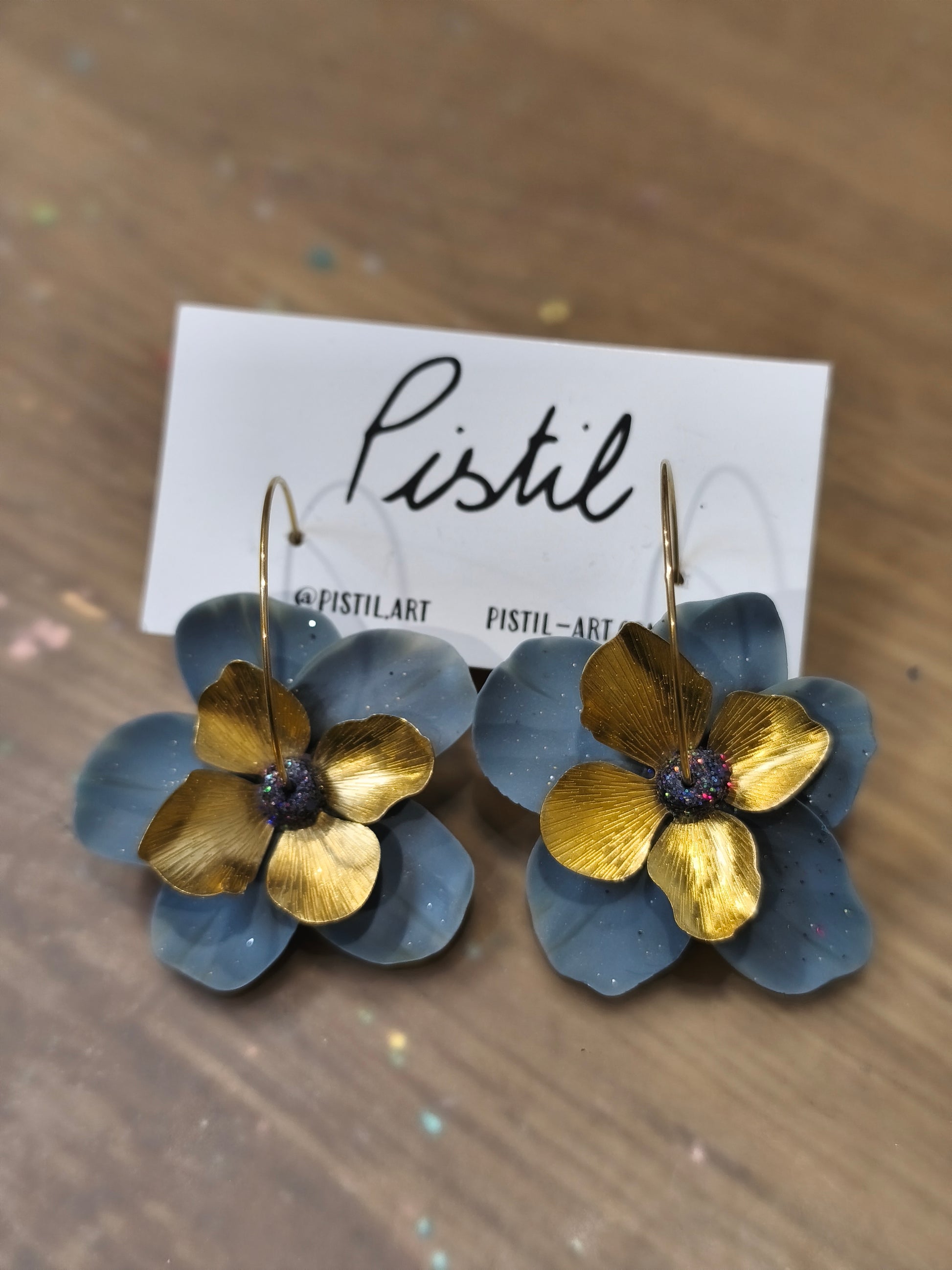 Des fleurs qui ne fanent jamais, à porter fièrement aux oreilles. Modelées à la main dans les tond bleu. Elles attirent les regards sans en faire trop, et se marient aussi bien avec une tenue sobre qu'un look plus affirmé. Un bijou poétique et audacieux, pensé pour celles qui aiment sortir du cadre.