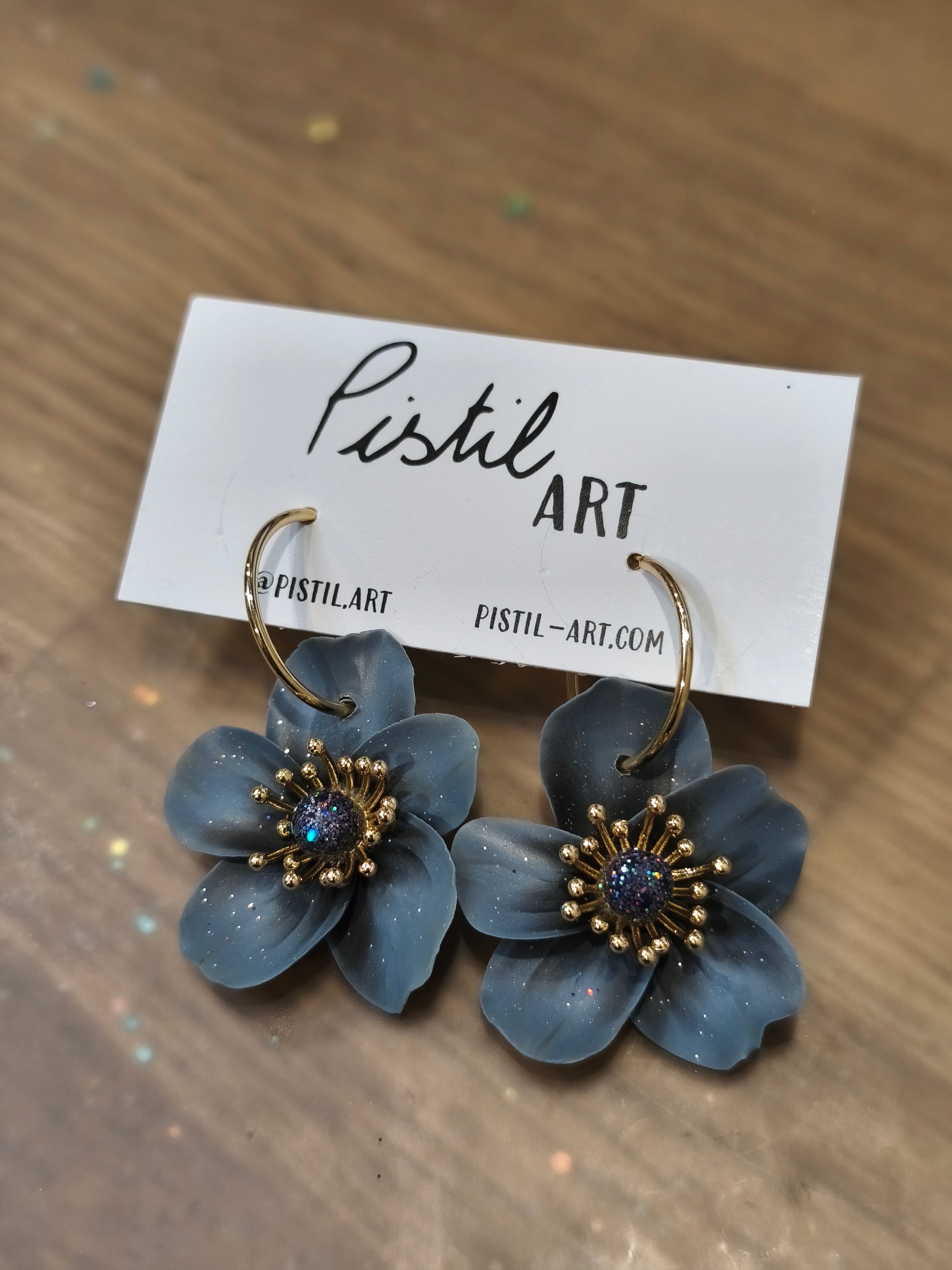 Des fleurs qui ne fanent jamais, à porter fièrement aux oreilles. Modelées à la main dans les tond bleu. Elles attirent les regards sans en faire trop, et se marient aussi bien avec une tenue sobre qu'un look plus affirmé. Un bijou poétique et audacieux, pensé pour celles qui aiment sortir du cadre.