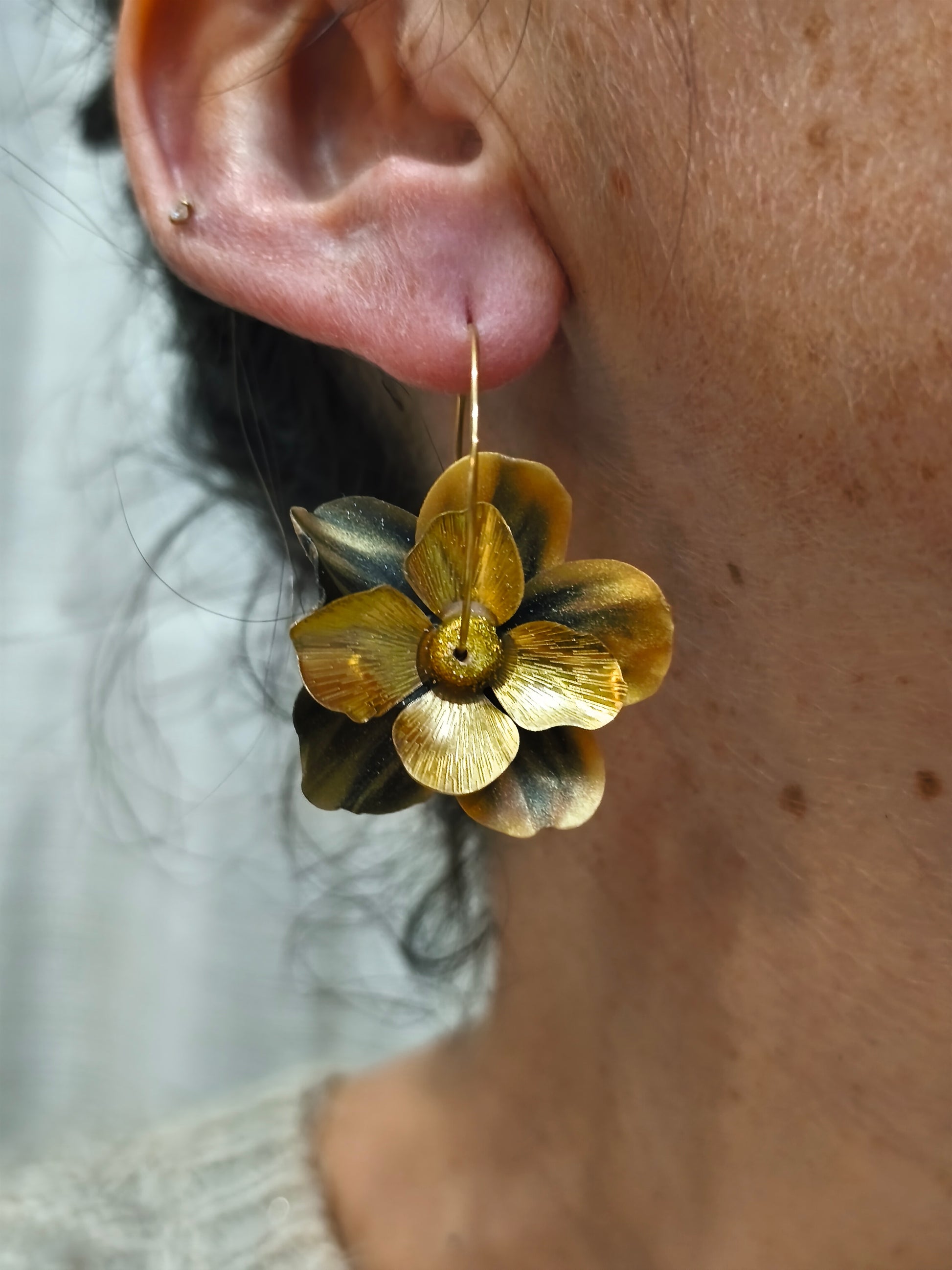 Des fleurs qui ne fanent jamais, à porter fièrement aux oreilles. Modelées à la main dans les tons noir et doré. Elles attirent les regards sans en faire trop, et se marient aussi bien avec une tenue sobre qu'un look plus affirmé. Un bijou poétique et audacieux, pensé pour celles qui aiment sortir du cadre.