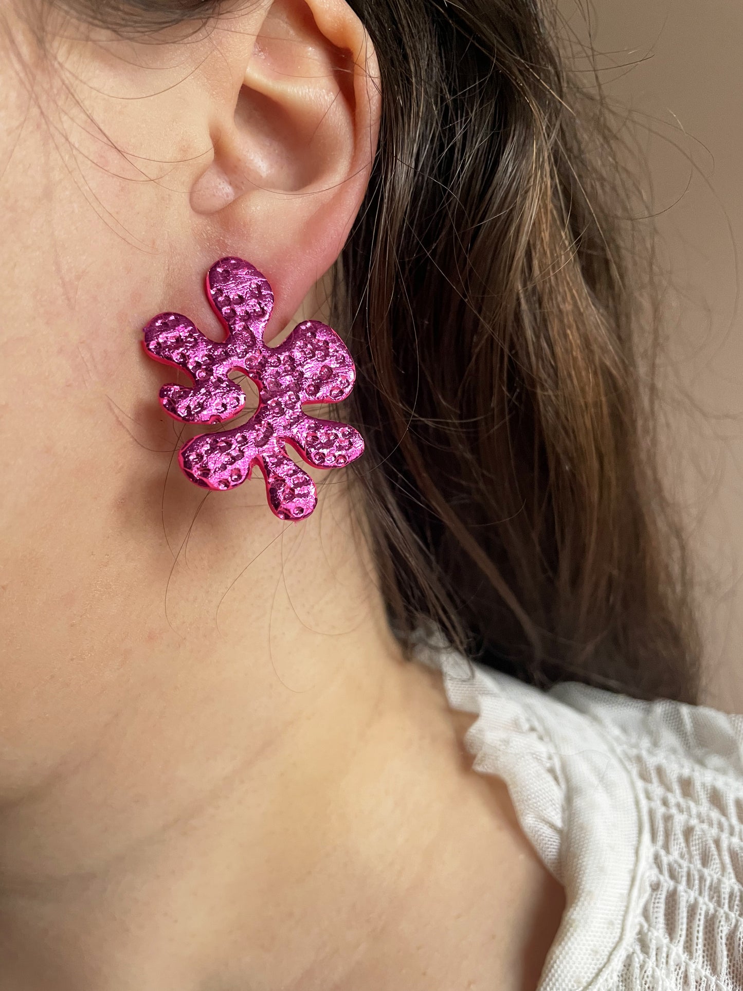 Plongez dans l’intensité et l’élégance des boucles d'oreilles Désir Passionné. Inspirées par les formes organiques des feuilles, ces créations arborent un design abstrait rehaussé d’une délicate feuille d’or fuchsia martelée. Chaque paire capte la lumière avec grâce, dévoilant des reflets éclatants et un charme irrésistible. À la fois audacieuses et raffinées, elles incarnent la passion et la singularité.