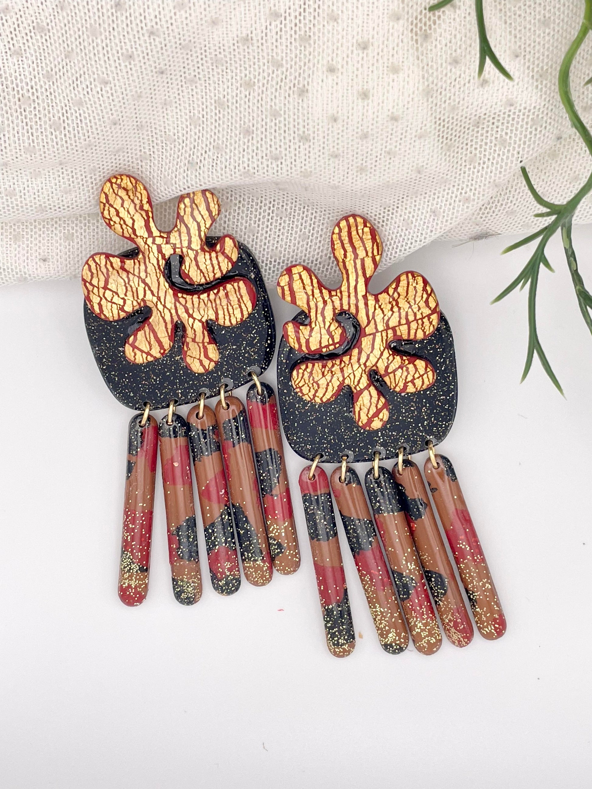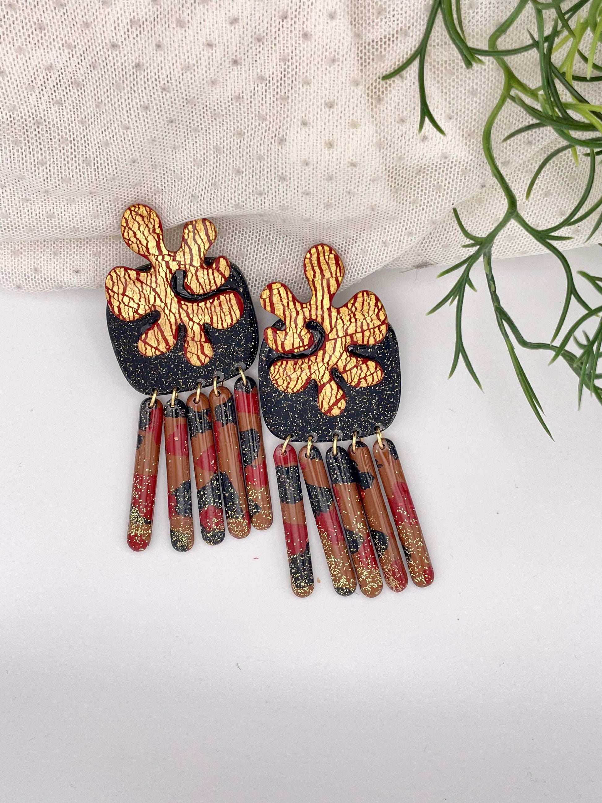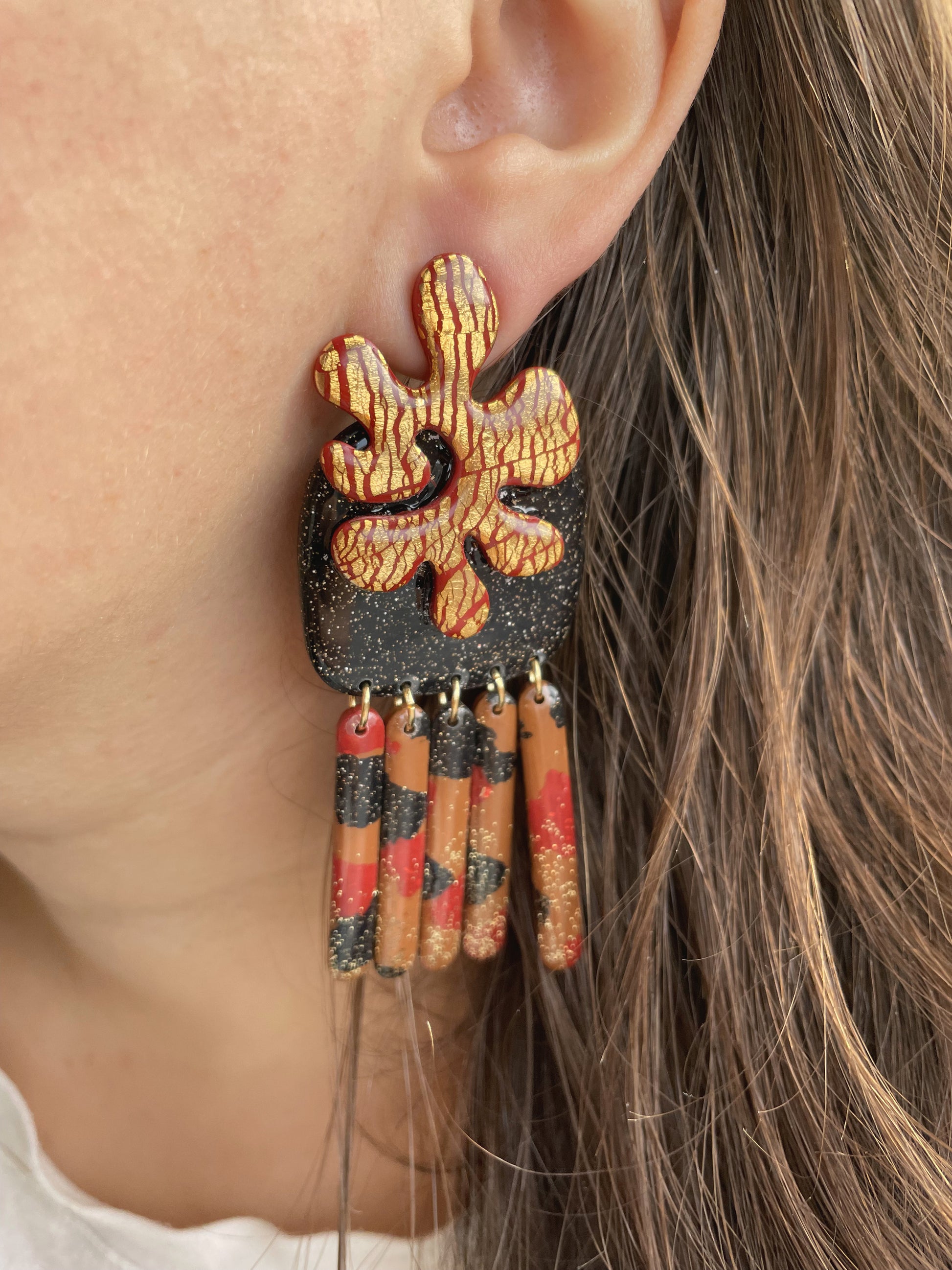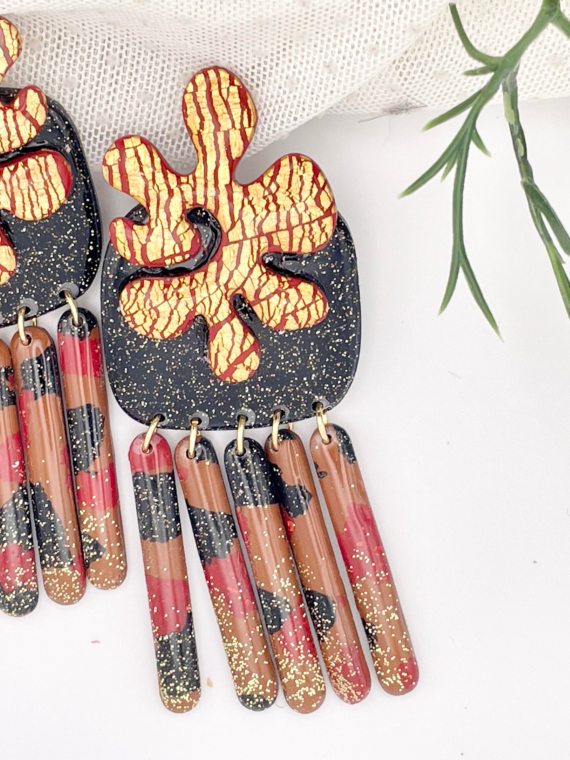 Découvrez Eclipse Night, une paire de boucles d'oreilles spectaculaires où le mystère de la nuit rencontre l'intensité d'une éclipse. Les motifs dorés craquelés, tels des rayons solaires, se dessinent sur un fond noir scintillant, évoquant le contraste hypnotisant entre l'ombre et la lumière. Les pampilles aux teintes rouges, noires et or, agrémentées de touches pailletées, dansent au moindre mouvement pour apporter une allure unique, élégante et audacieuse.