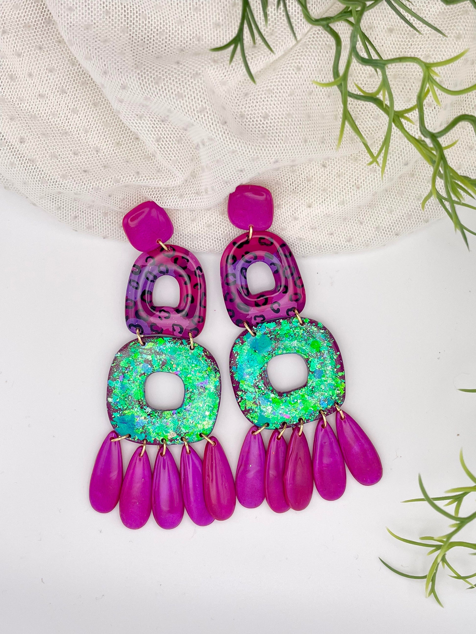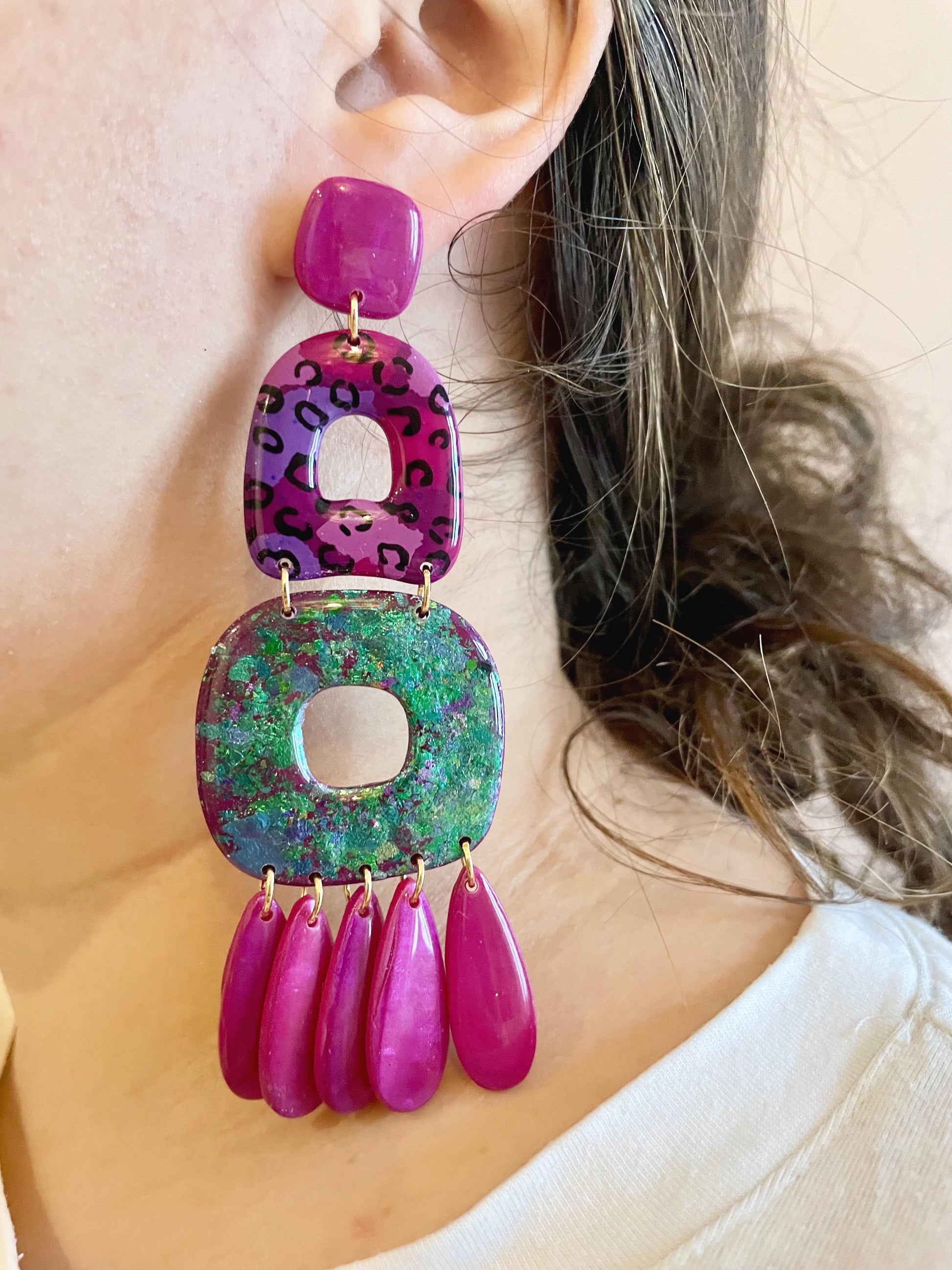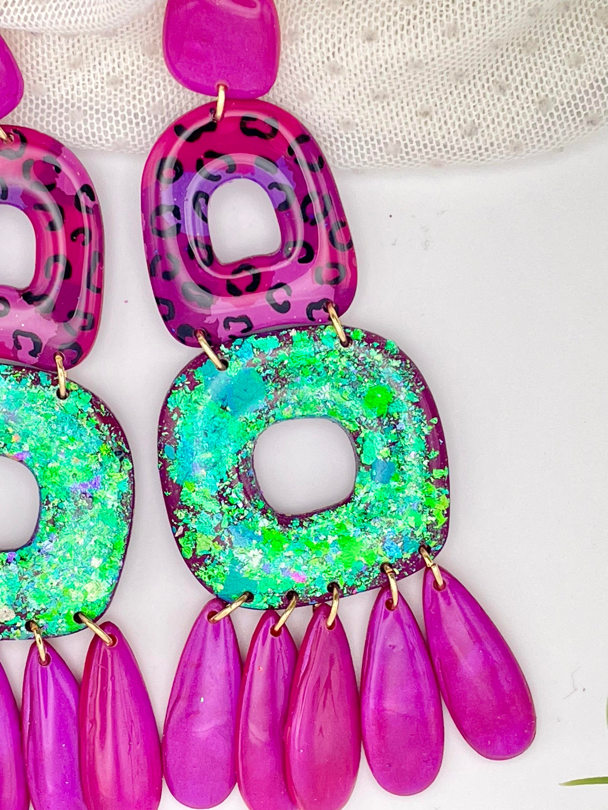 Élevez votre look nocturne avec les boucles d'oreilles "Jungle Night" de la collection NIGHT. Ces longues boucles d'oreilles allient l'audace des motifs léopard à la douceur des teintes rose et verte, sublimées par des reflets mauves subtils. Une touche sauvage et élégante qui capte la lumière à chaque mouvement. Légères et confortables, elles sont idéales pour ajouter une note de mystère à vos soirées.
