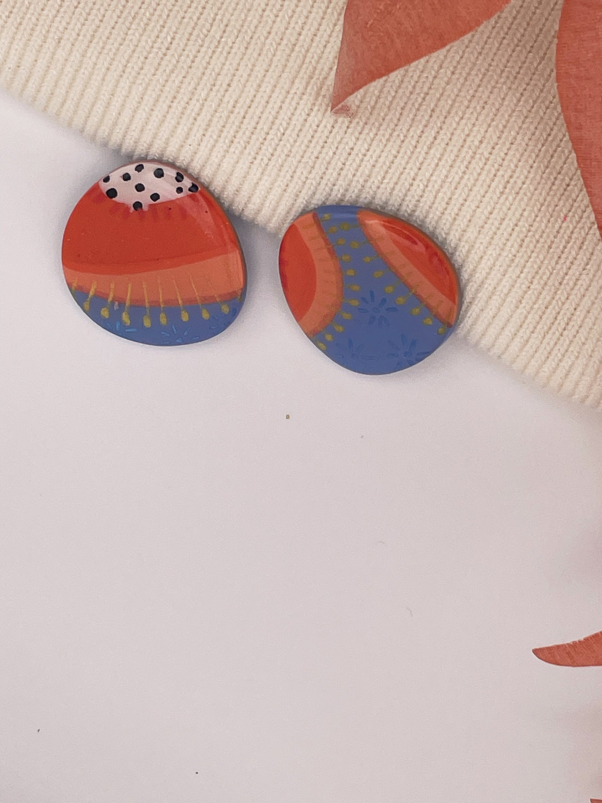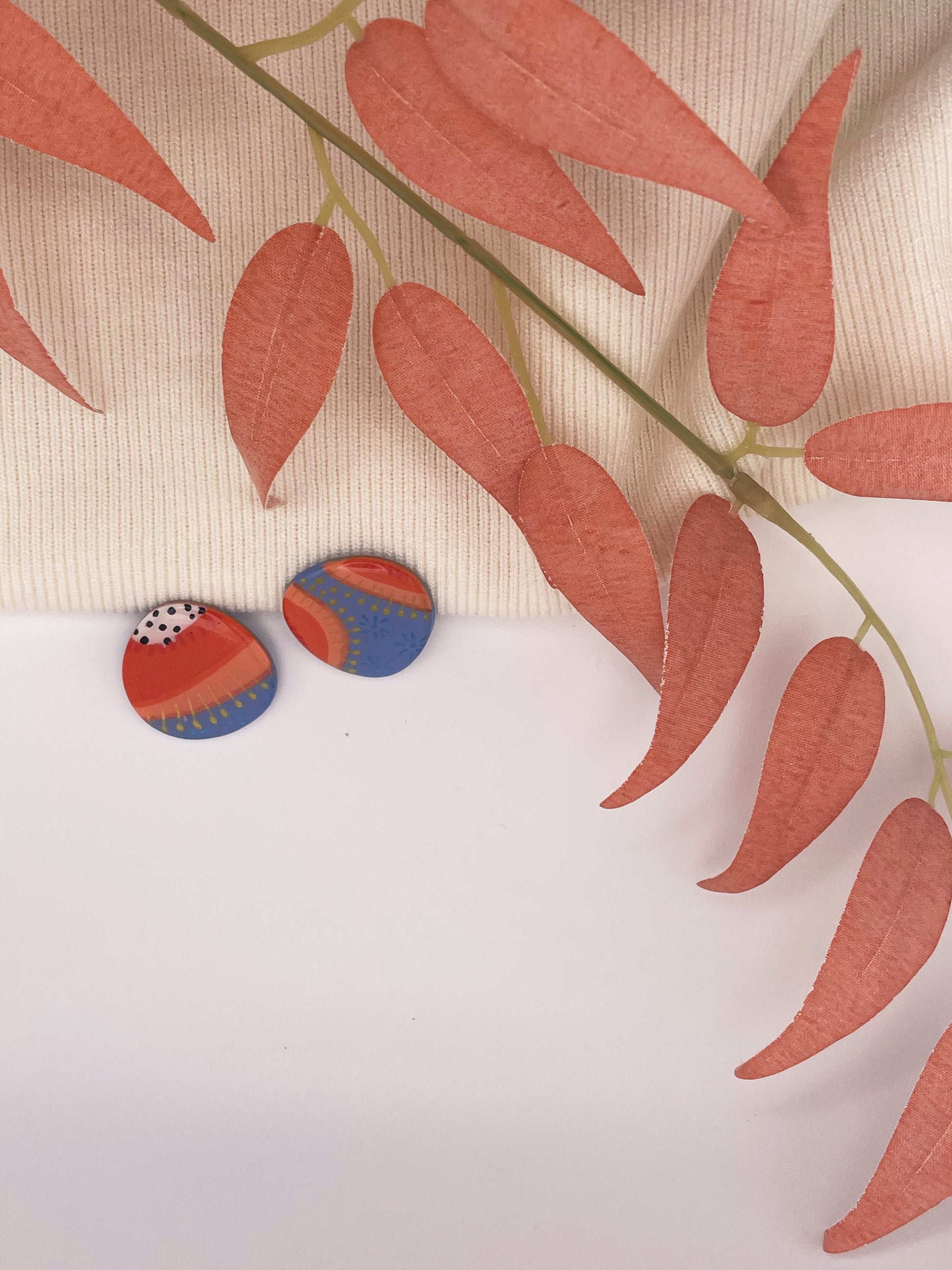 - Design raffiné : Une puce texturée corail rehaussée de motifs peints à la main, dans des tons chauds et vibrants d'orange, bleu et doré. Une interprétation minimaliste mais tout aussi captivante de la version pendante.