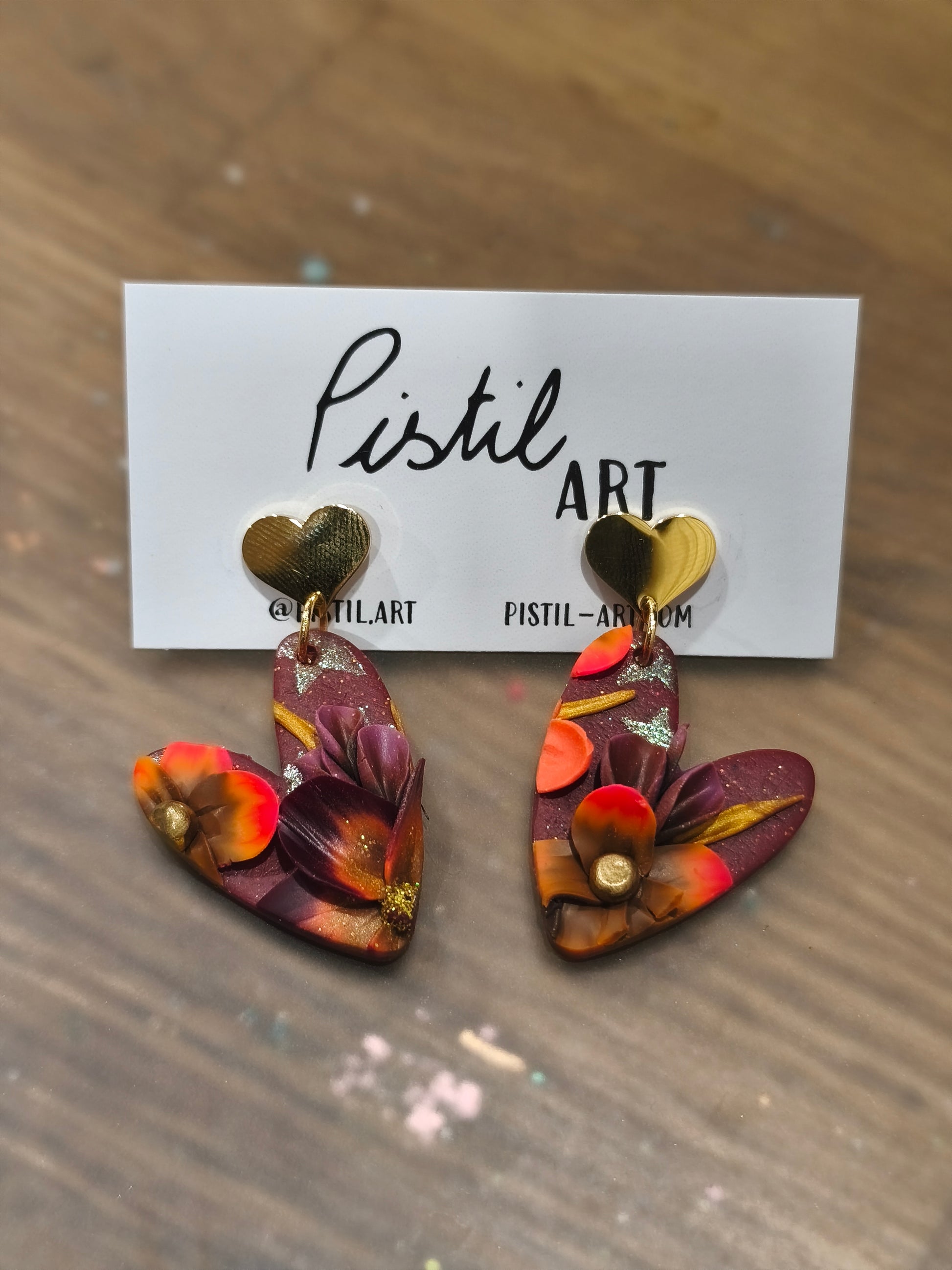 Des fleurs qui ne fanent jamais, à porter fièrement aux oreilles. Modelées à la main dans les tons bordeau, marron, orange et doré. Elles attirent les regards sans en faire trop, et se marient aussi bien avec une tenue sobre qu'un look plus affirmé. Un bijou poétique et audacieux, pensé pour celles qui aiment sortir du cadre.
