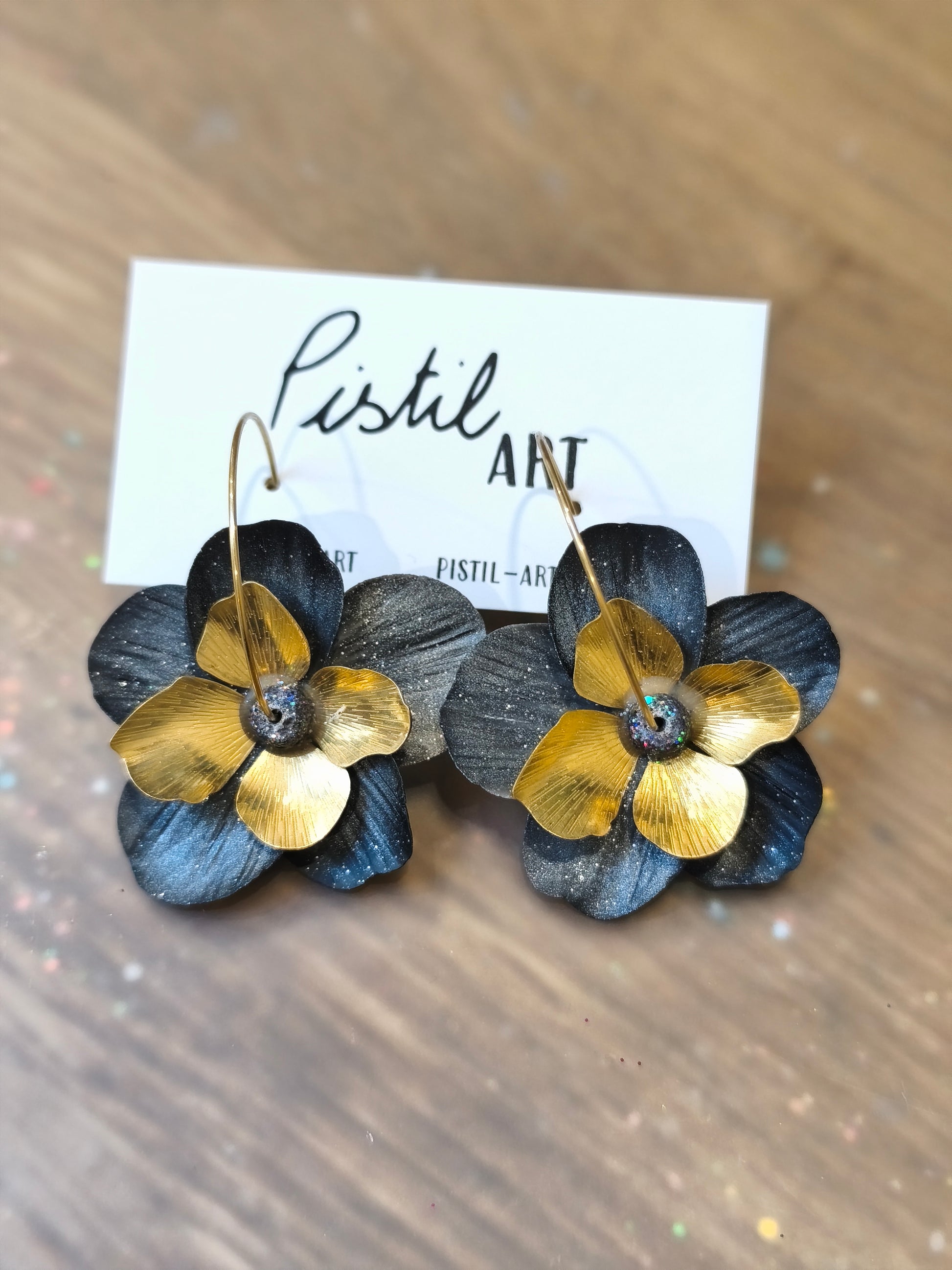 Des fleurs qui ne fanent jamais, à porter fièrement aux oreilles. Modelées à la main dans les tons noir et argenté. Elles attirent les regards sans en faire trop, et se marient aussi bien avec une tenue sobre qu'un look plus affirmé. Un bijou poétique et audacieux, pensé pour celles qui aiment sortir du cadre.
