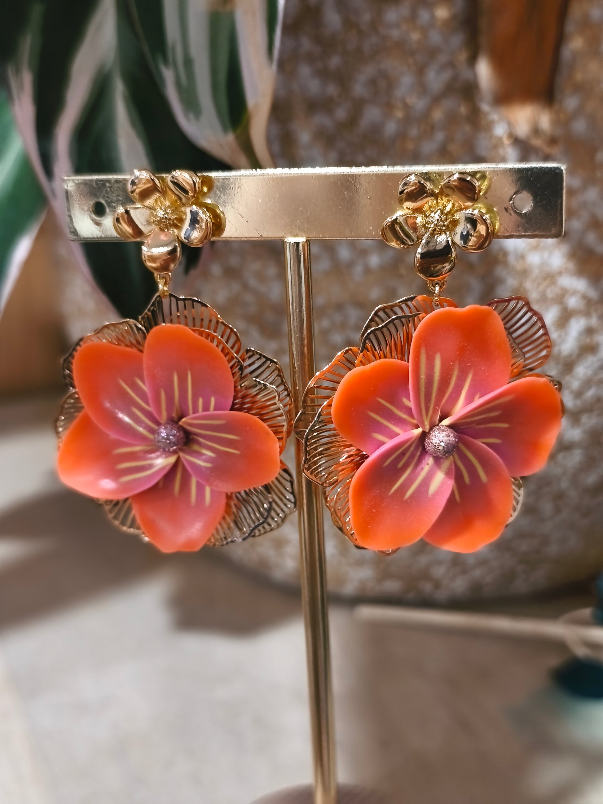 Les Boucles d’oreilles fleur Coralie sont des boucles d’oreilles pendantes au style floral et lumineux. Elles associent une grande fleur en métal à une fleur en pâte polymère, dans des tons corail rehaussés de traits jaunes et d’un cœur à paillettes. Cette combinaison de matières apporte du relief et de l’équilibre, tout en conservant une grande légèreté. Les Boucles d’oreilles fleur Coralie sont pensées pour être agréables à porter au quotidien, tout en apportant une touche élégante et originale à une tenue.