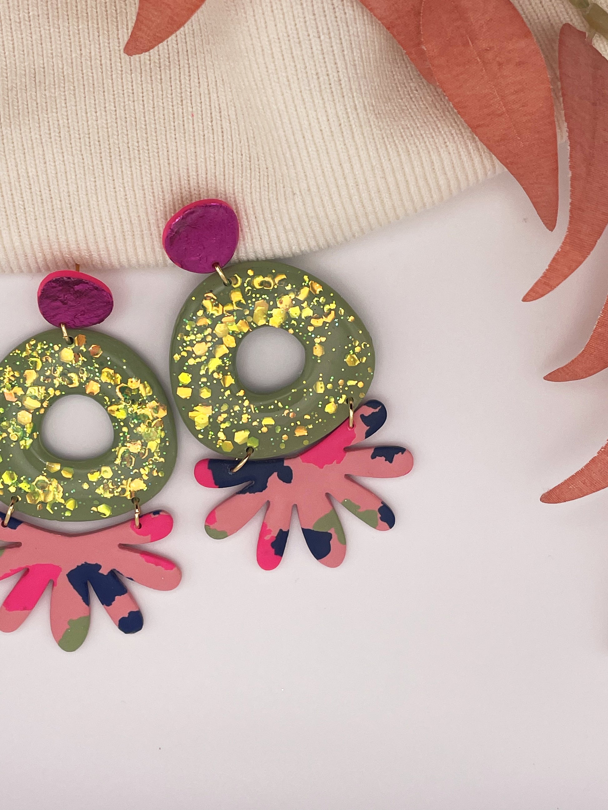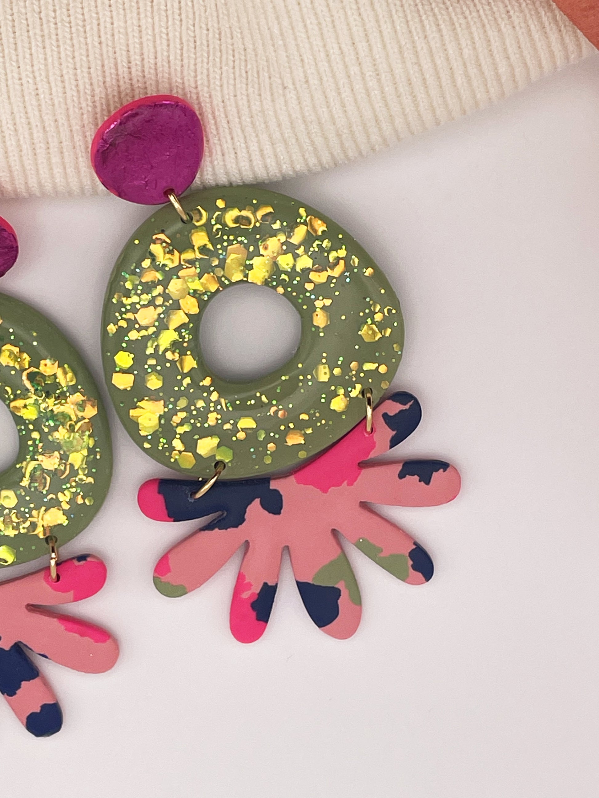 Design éblouissant : Une base en cercle vert scintillant avec des paillettes captivantes, accompagnée d'une fleur rose éclatante ornée de motifs peints à la main en fuchsia, bleu et vert.