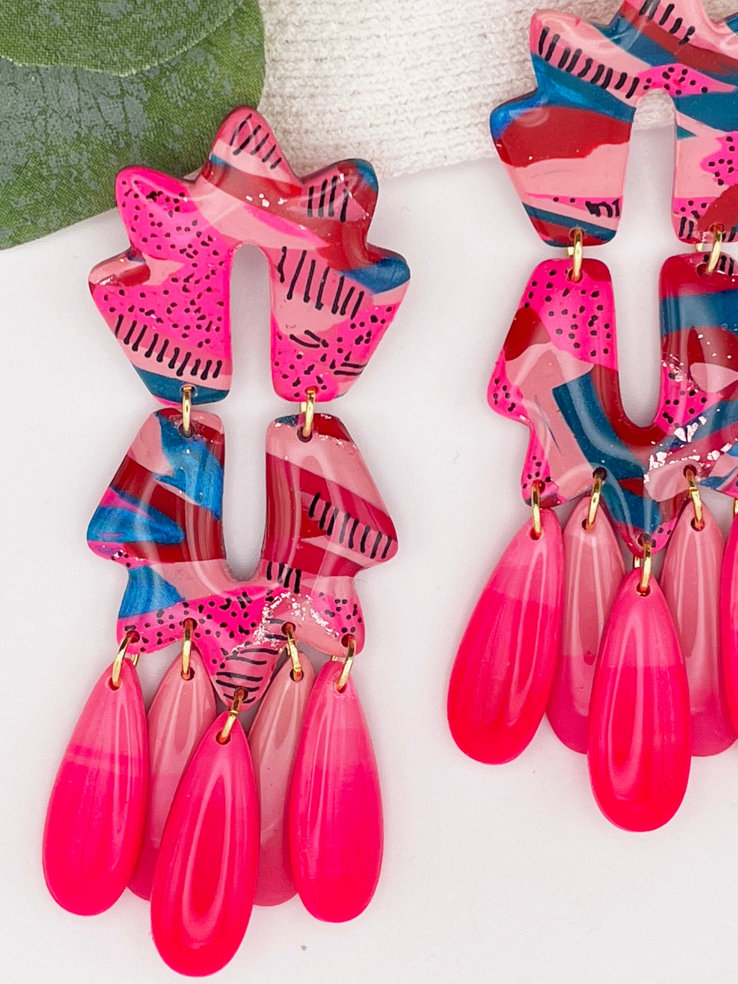 - Matériaux : pâte polymère avec motifs dessinés à la main, pampilles en résine translucide